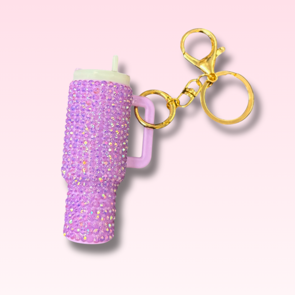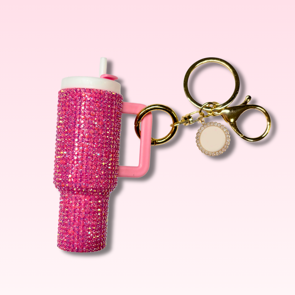 Looking to capitalize on the viral bag charm trend? Our mini rhinestone Stanley -inspired bag charm delivers bold sparkle in a compact, high-impact accessory your customers will love. Price includes a fully rhinestoned mini tumbler charm with a custom logo charm designed to clip onto handbags, backpacks, keychains, and promotional kits.